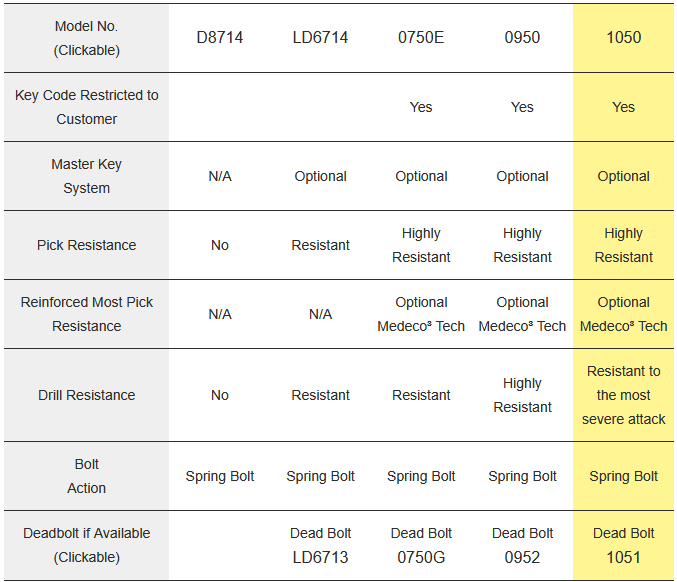 There are lots of Medeco locks on the market - but not all Medeco locks are equal! The locks we stock are top-of-the-line, and the most secure locks money can buy. The locks on Amazon or elsewhere for half the price are not the same lock we are selling, as you can see from this part number chart below:
